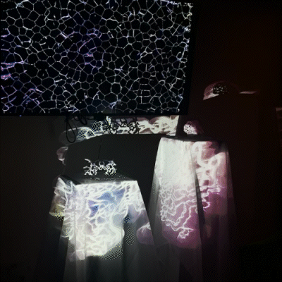 The interactive digital component of the installation features generative visuals and sounds that respond dynamically to physical movements and ambient sounds, creating an immersive multisensory experience for the audience. Created using Touch Designer, the visuals emulate the organic patterns of water ripples and the captivating play of light reflections, inviting metaphorical connections between nature and technology. These visuals harmonize with the soundscape, expertly composed through Ableton, which enriches the emotional resonance of the space. As visitors navigate the installation, their presence distorts and transforms both visuals and sounds, metaphorically echoing the influence of human actions on the interplay of data and technology. This interactive layer adds an ever-changing dimension to the installation, bridging the realms of art and technology and prompting contemplation on the repercussions of individual agency within an evolving digital landscape.